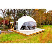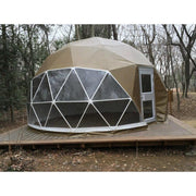 Our domes are available in multiple sizes and built for year-round use across North America. this 16 ft diameter dome includes two vents, double-sided insulated liner, a skylight, two portholes, and glass door and frame. The strong steel frame and high-quality PVC cover create a durable, weather-resistant shelter perfect for glamping, homesteading, or outdoor living.